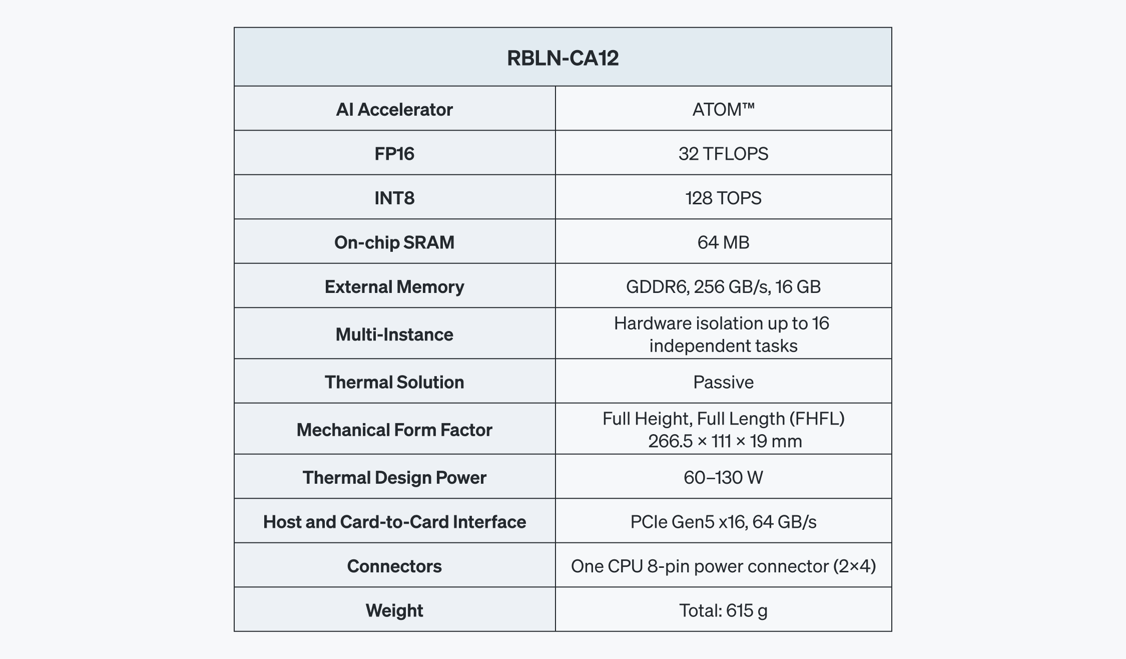 ATOM™はRBLN-CA12というシングルスロット、FHFL(Full Height, Full Length) PCIe Gen5カードで提供されます。最大電力(Thermal Design Power、TDP)は60~130Wで、256GB/s帯域幅のGDDR6メモリとPCIe Gen5x16インタフェースを介して、ホストやカード、さらにカード間通信に対応します。また、マルチインスタンス(Multi-Instance)機能を通じて、16個の独立したハードウェア分離インスタンスで分割し、高い並列性とリソース配分を動的に管理できます。