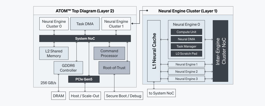 ATOM™の階層的なメモリアーキテクチャは、最高水準の性能効率性を確保するように設計されています。このため、ニューラルエンジンに十分な帯域幅を提供すると同時にレイテンシを最小化します。