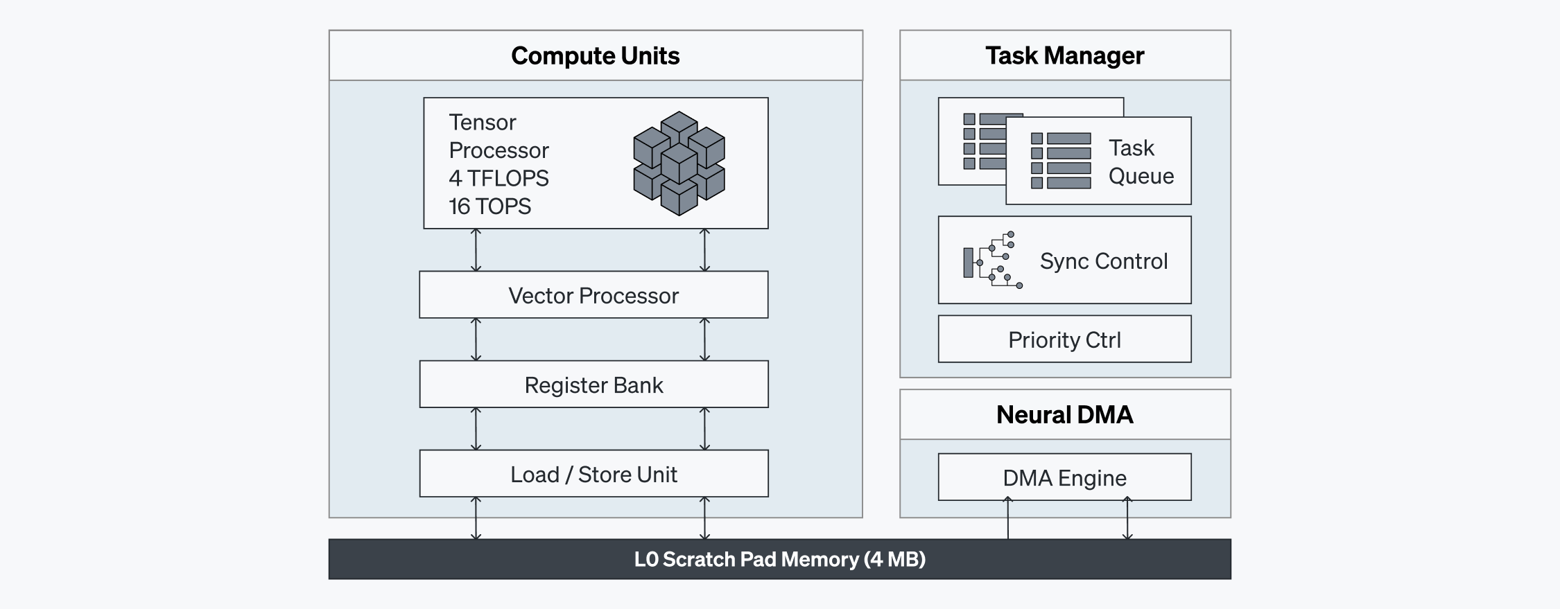 4 MBスクラッチパッド(Scratch Padメモリが含まれた演算ユニットは、最大8TB/s速度でSRAMの中間データにアクセスでき、外部メモリへの依存性を最小化します。これにより、帯域幅の限界を補い処理速度を上げます。各ニューラルエンジンに搭載されたタスクマネージャー(Task Manager)はローカルハードウェアレベルで同期化を加速し、コマンドプロセッサ(Command Processor)と協力して稼働率を最大限に引き上げます。