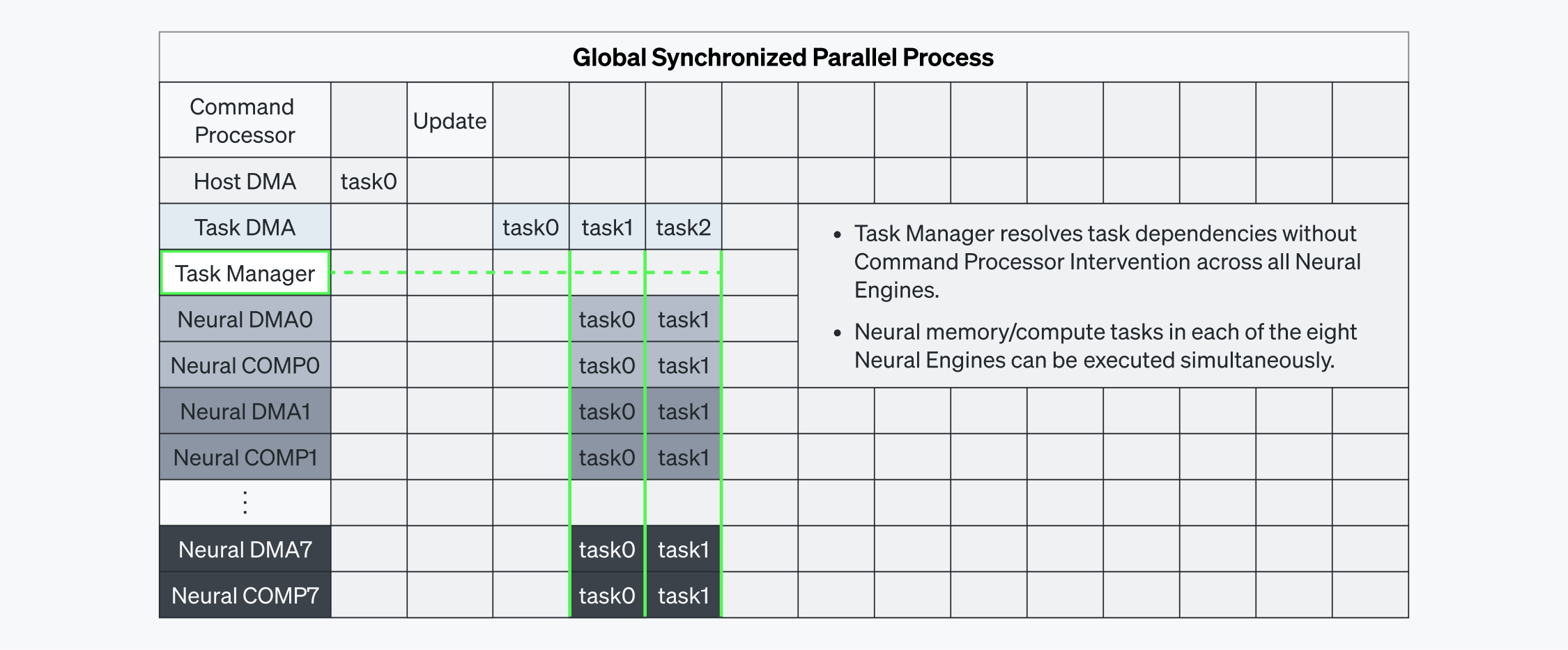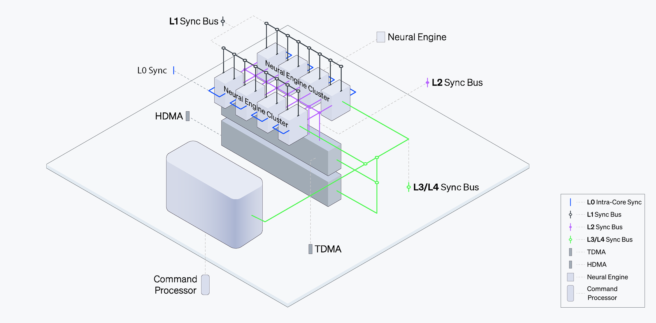 ニューラルエンジンはL1同期化バス(L1 Sync Bus)を介してタスクマネージャーと通信し、このタスクマネージャーはL2同期化バス(L2 Sync Bus)を介してタスクレベルのDMAとも連携します。このような構成でシステム全体の依存性を確かめ、多様なコアを同期化することで高密度な計算タスクを実行できます。