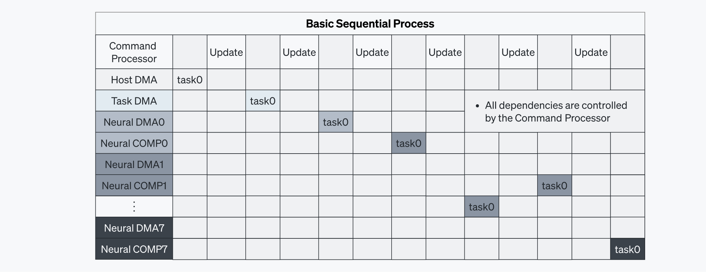 コマンドプロセッサがコマンドの実行を単独で管理すると、タスクが順番に処理されるためレイテンシが増えます。タスクへの依存性が解消されるまで、コマンドプロセッサの処理を待たなければならないからです(図5-1を参照)。この方式では通信オーバーヘッドが発生しやすくなります。