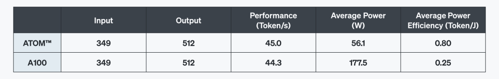 テストの結果、ATOM™はA100と比較して最大44%高い電力効率を実現し、複雑な言語処理向けのワークロードでも優れた性能と効率性を見せました。